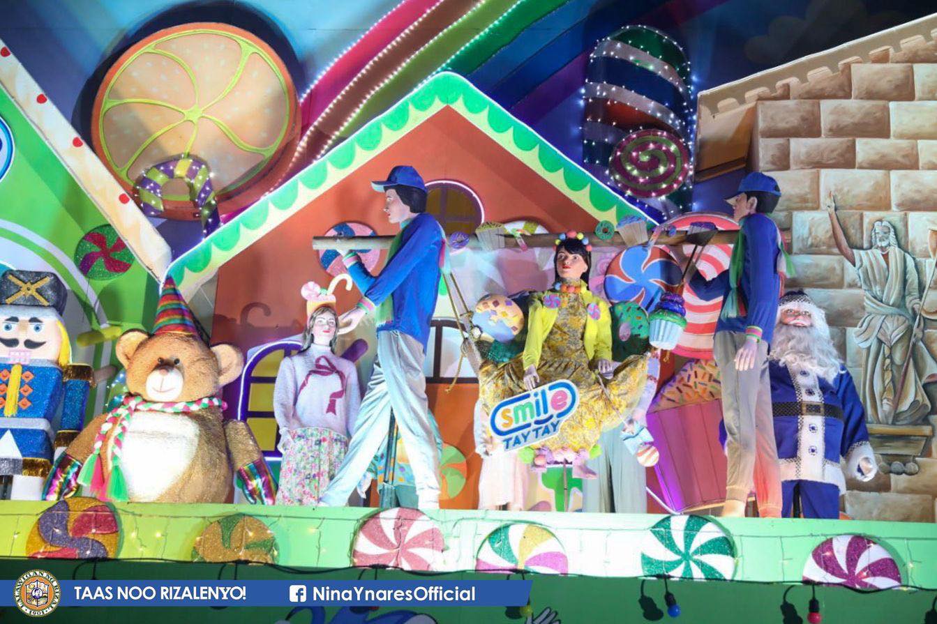 Ang pinailawang YES Recycled Giant Christmas Tree ng Taytay ay gawa sa mga old tela, reused kulambo at repurposed styrofoam na ginawang mga candies, donuts, flowers at butterflies pati na rin old lights, proving that recycling and creativity can turn simple materials into a magical Christmas display.